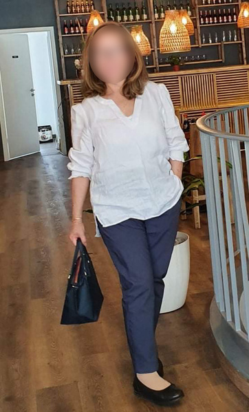 | Haare: | dunkelblond, schulterlang, glatt |