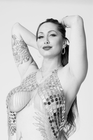 | Körperschmuck: | Tattoos, Nabel-Piercing |